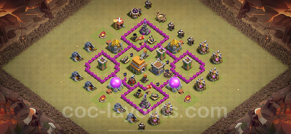 This Town Hall 6 war base is specifically designed to defend against 2-star and 3-star attacks in Clan Wars and Clan War Leagues. The strategic placement of defenses creates multiple compartments that force attackers to use more troops and spells than anticipated. Key defensive structures like Eagle Artillery, Inferno Towers, and X-Bows are positioned to cover crucial sections of the base, making it extremely difficult for opponents to secure a perfect attack. The core of this war base features a centralized Town Hall and Clan Castle, protected by multiple layers of walls and high-damage defenses. This layout forces attackers to commit significant resources just to reach the center, often leaving them without enough firepower to secure the Town Hall destruction. The anti-2-star design ensures that even if attackers breach the outer defenses, they'll struggle to achieve a 50% destruction rating. Air defenses are strategically spread to counter popular air attack strategies like LaLoon (Lava Hound + Balloons) and Electrone (Electro Dragons + Stone Slammer). The symmetrical trap placement and strategic Hidden Tesla positions create deadly surprise elements that can completely derail an attacker's plan. This base has been tested against various meta attack strategies and has consistently proven effective in preventing 3-star attacks.