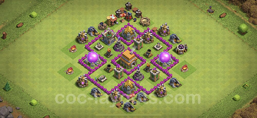 This Town Hall 6 war base is specifically designed to defend against 2-star and 3-star attacks in Clan Wars and Clan War Leagues. The strategic placement of defenses creates multiple compartments that force attackers to use more troops and spells than anticipated. Key defensive structures like Eagle Artillery, Inferno Towers, and X-Bows are positioned to cover crucial sections of the base, making it extremely difficult for opponents to secure a perfect attack. The core of this war base features a centralized Town Hall and Clan Castle, protected by multiple layers of walls and high-damage defenses. This layout forces attackers to commit significant resources just to reach the center, often leaving them without enough firepower to secure the Town Hall destruction. The anti-2-star design ensures that even if attackers breach the outer defenses, they'll struggle to achieve a 50% destruction rating. Air defenses are strategically spread to counter popular air attack strategies like LaLoon (Lava Hound + Balloons) and Electrone (Electro Dragons + Stone Slammer). The symmetrical trap placement and strategic Hidden Tesla positions create deadly surprise elements that can completely derail an attacker's plan. This base has been tested against various meta attack strategies and has consistently proven effective in preventing 3-star attacks.