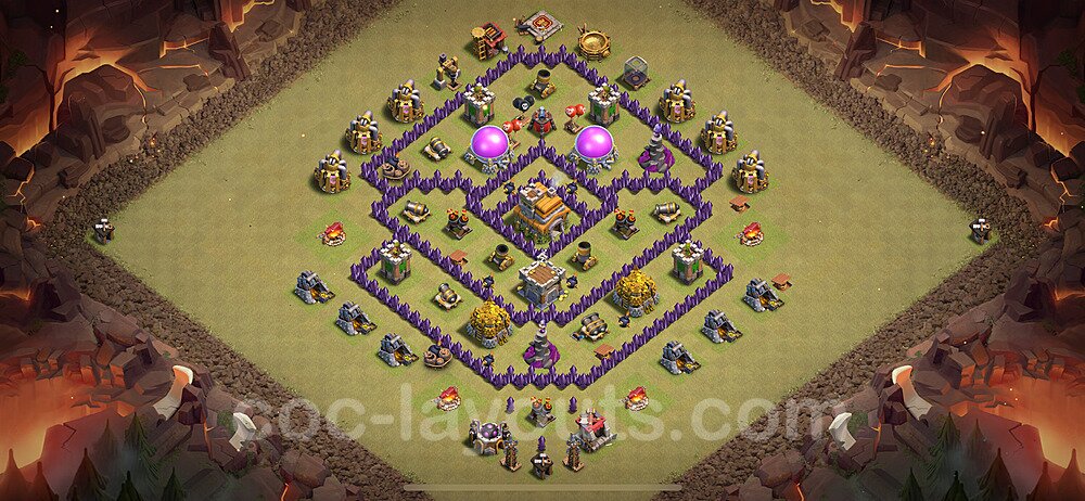This Town Hall 7 war base is specifically designed to defend against 2-star and 3-star attacks in Clan Wars and Clan War Leagues. The strategic placement of defenses creates multiple compartments that force attackers to use more troops and spells than anticipated. Key defensive structures like Eagle Artillery, Inferno Towers, and X-Bows are positioned to cover crucial sections of the base, making it extremely difficult for opponents to secure a perfect attack. The core of this war base features a centralized Town Hall and Clan Castle, protected by multiple layers of walls and high-damage defenses. This layout forces attackers to commit significant resources just to reach the center, often leaving them without enough firepower to secure the Town Hall destruction. The anti-2-star design ensures that even if attackers breach the outer defenses, they'll struggle to achieve a 50% destruction rating. Air defenses are strategically spread to counter popular air attack strategies like LaLoon (Lava Hound + Balloons) and Electrone (Electro Dragons + Stone Slammer). The symmetrical trap placement and strategic Hidden Tesla positions create deadly surprise elements that can completely derail an attacker's plan. This base has been tested against various meta attack strategies and has consistently proven effective in preventing 3-star attacks.