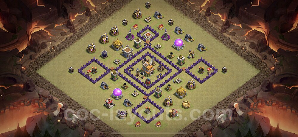 This Town Hall 7 war base is specifically designed to defend against 2-star and 3-star attacks in Clan Wars and Clan War Leagues. The strategic placement of defenses creates multiple compartments that force attackers to use more troops and spells than anticipated. Key defensive structures like Eagle Artillery, Inferno Towers, and X-Bows are positioned to cover crucial sections of the base, making it extremely difficult for opponents to secure a perfect attack. The core of this war base features a centralized Town Hall and Clan Castle, protected by multiple layers of walls and high-damage defenses. This layout forces attackers to commit significant resources just to reach the center, often leaving them without enough firepower to secure the Town Hall destruction. The anti-2-star design ensures that even if attackers breach the outer defenses, they'll struggle to achieve a 50% destruction rating. Air defenses are strategically spread to counter popular air attack strategies like LaLoon (Lava Hound + Balloons) and Electrone (Electro Dragons + Stone Slammer). The symmetrical trap placement and strategic Hidden Tesla positions create deadly surprise elements that can completely derail an attacker's plan. This base has been tested against various meta attack strategies and has consistently proven effective in preventing 3-star attacks.