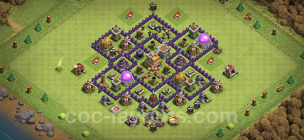 This Town Hall 7 hybrid base offers the best of both worlds - strong resource protection combined with effective trophy defense. The versatile design makes it an excellent choice for players who want to protect their loot while maintaining their trophy count. This balanced approach ensures you don't sacrifice one aspect of defense for another, making it ideal for active players across all league levels. The hybrid layout features centralized resource storages alongside a well-protected Town Hall, with multiple defensive layers that deter both farming raids and trophy pushers. High-value targets are strategically positioned within overlapping defense ranges, forcing attackers to make difficult choices about which objectives to prioritize. The compartmentalized design prevents attackers from easily achieving both loot destruction and the Town Hall kill in a single attack. Defense placement in this hybrid base creates strong coverage against both ground and air attacks. Inferno Towers, X-Bows, and Eagle Artillery work in concert to eliminate threats quickly, while splash damage defenses like Wizard Towers and Bomb Towers counter swarm strategies. The base's funnel-resistant design and strategic trap placement make it effective against popular attack strategies including QC LaLoon (Queen Charge Lava Hound Balloon), Blizzard attacks, and Yeti Smash compositions.