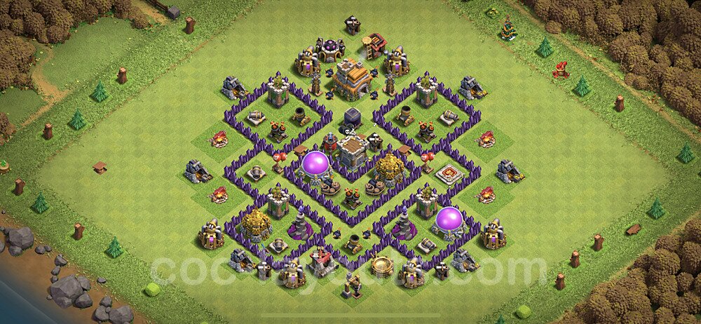 This Town Hall 7 farming base is optimized to protect your resources including Gold, Elixir, and Dark Elixir from raiders. The layout features centralized storages with multiple compartments that make it extremely difficult for attackers to steal large amounts of resources in a single raid. This design philosophy prioritizes resource protection over trophies, making it ideal for players focused on upgrading their village. The strategic placement of resource storages ensures they are well-protected by high-damage defenses like X-Bows, Inferno Towers, and Eagle Artillery. Each storage is surrounded by multiple wall layers and defensive structures, forcing attackers to invest heavily in troops and spells to reach your loot. The farming base design also incorporates strategic dead zones where attackers' troops tend to path inefficiently, wasting time and taking heavy damage from nearby defenses. Collectors and mines are positioned on the outer edges as "bait" while your main storages remain heavily protected in the core. This layout has proven effective against common farming strategies like BARCH (Barbarians + Archers), GoWiPe (Golems + Wizards + Pekka), and mass Miner attacks. The compartmentalized design prevents attackers from funneling straight to your resources, ensuring you maintain your hard-earned loot for important upgrades.