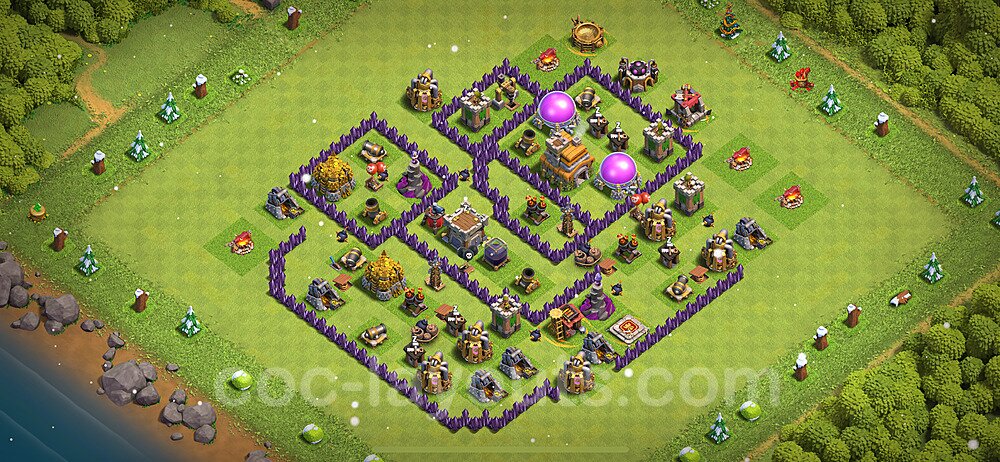 This Town Hall 7 hybrid base offers the best of both worlds - strong resource protection combined with effective trophy defense. The versatile design makes it an excellent choice for players who want to protect their loot while maintaining their trophy count. This balanced approach ensures you don't sacrifice one aspect of defense for another, making it ideal for active players across all league levels. The hybrid layout features centralized resource storages alongside a well-protected Town Hall, with multiple defensive layers that deter both farming raids and trophy pushers. High-value targets are strategically positioned within overlapping defense ranges, forcing attackers to make difficult choices about which objectives to prioritize. The compartmentalized design prevents attackers from easily achieving both loot destruction and the Town Hall kill in a single attack. Defense placement in this hybrid base creates strong coverage against both ground and air attacks. Inferno Towers, X-Bows, and Eagle Artillery work in concert to eliminate threats quickly, while splash damage defenses like Wizard Towers and Bomb Towers counter swarm strategies. The base's funnel-resistant design and strategic trap placement make it effective against popular attack strategies including QC LaLoon (Queen Charge Lava Hound Balloon), Blizzard attacks, and Yeti Smash compositions.