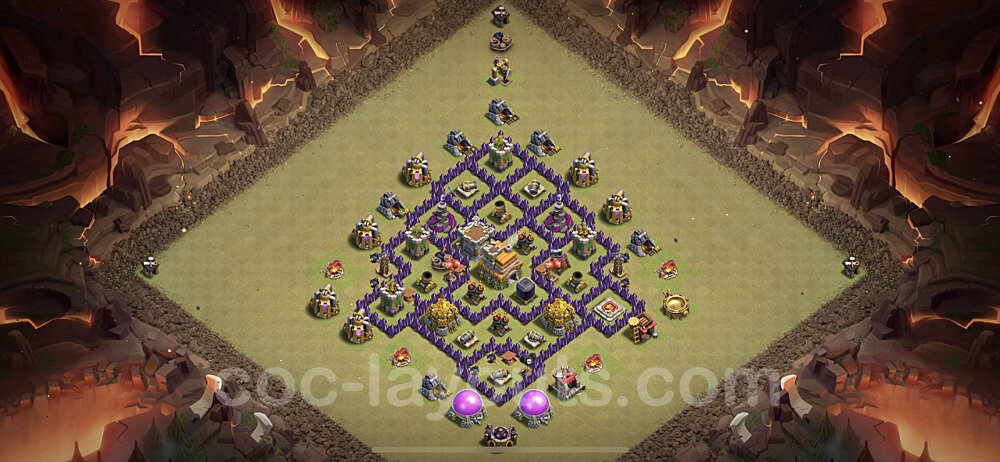 This Town Hall 7 war base is specifically designed to defend against 2-star and 3-star attacks in Clan Wars and Clan War Leagues. The strategic placement of defenses creates multiple compartments that force attackers to use more troops and spells than anticipated. Key defensive structures like Eagle Artillery, Inferno Towers, and X-Bows are positioned to cover crucial sections of the base, making it extremely difficult for opponents to secure a perfect attack. The core of this war base features a centralized Town Hall and Clan Castle, protected by multiple layers of walls and high-damage defenses. This layout forces attackers to commit significant resources just to reach the center, often leaving them without enough firepower to secure the Town Hall destruction. The anti-2-star design ensures that even if attackers breach the outer defenses, they'll struggle to achieve a 50% destruction rating. Air defenses are strategically spread to counter popular air attack strategies like LaLoon (Lava Hound + Balloons) and Electrone (Electro Dragons + Stone Slammer). The symmetrical trap placement and strategic Hidden Tesla positions create deadly surprise elements that can completely derail an attacker's plan. This base has been tested against various meta attack strategies and has consistently proven effective in preventing 3-star attacks.