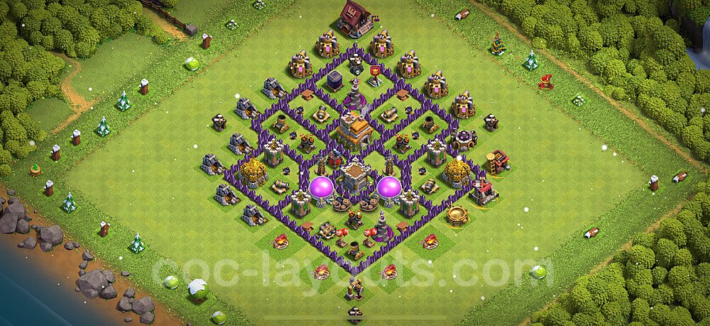 This Town Hall 7 war base is specifically designed to defend against 2-star and 3-star attacks in Clan Wars and Clan War Leagues. The strategic placement of defenses creates multiple compartments that force attackers to use more troops and spells than anticipated. Key defensive structures like Eagle Artillery, Inferno Towers, and X-Bows are positioned to cover crucial sections of the base, making it extremely difficult for opponents to secure a perfect attack. The core of this war base features a centralized Town Hall and Clan Castle, protected by multiple layers of walls and high-damage defenses. This layout forces attackers to commit significant resources just to reach the center, often leaving them without enough firepower to secure the Town Hall destruction. The anti-2-star design ensures that even if attackers breach the outer defenses, they'll struggle to achieve a 50% destruction rating. Air defenses are strategically spread to counter popular air attack strategies like LaLoon (Lava Hound + Balloons) and Electrone (Electro Dragons + Stone Slammer). The symmetrical trap placement and strategic Hidden Tesla positions create deadly surprise elements that can completely derail an attacker's plan. This base has been tested against various meta attack strategies and has consistently proven effective in preventing 3-star attacks.