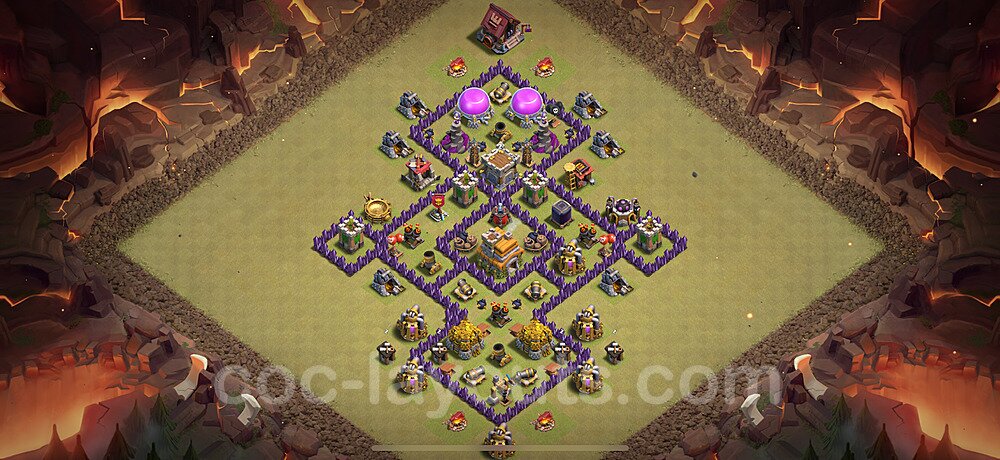 This Town Hall 7 hybrid base offers the best of both worlds - strong resource protection combined with effective trophy defense. The versatile design makes it an excellent choice for players who want to protect their loot while maintaining their trophy count. This balanced approach ensures you don't sacrifice one aspect of defense for another, making it ideal for active players across all league levels. The hybrid layout features centralized resource storages alongside a well-protected Town Hall, with multiple defensive layers that deter both farming raids and trophy pushers. High-value targets are strategically positioned within overlapping defense ranges, forcing attackers to make difficult choices about which objectives to prioritize. The compartmentalized design prevents attackers from easily achieving both loot destruction and the Town Hall kill in a single attack. Defense placement in this hybrid base creates strong coverage against both ground and air attacks. Inferno Towers, X-Bows, and Eagle Artillery work in concert to eliminate threats quickly, while splash damage defenses like Wizard Towers and Bomb Towers counter swarm strategies. The base's funnel-resistant design and strategic trap placement make it effective against popular attack strategies including QC LaLoon (Queen Charge Lava Hound Balloon), Blizzard attacks, and Yeti Smash compositions.