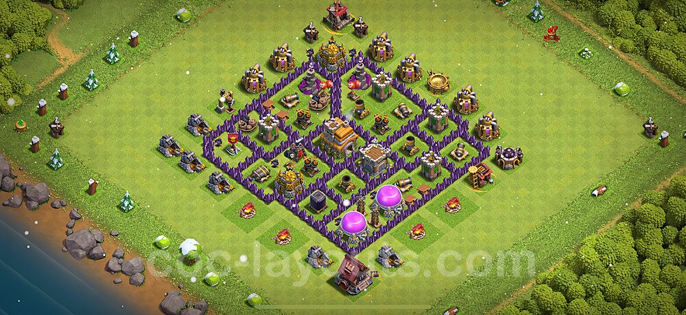 This Town Hall 7 hybrid base offers the best of both worlds - strong resource protection combined with effective trophy defense. The versatile design makes it an excellent choice for players who want to protect their loot while maintaining their trophy count. This balanced approach ensures you don't sacrifice one aspect of defense for another, making it ideal for active players across all league levels. The hybrid layout features centralized resource storages alongside a well-protected Town Hall, with multiple defensive layers that deter both farming raids and trophy pushers. High-value targets are strategically positioned within overlapping defense ranges, forcing attackers to make difficult choices about which objectives to prioritize. The compartmentalized design prevents attackers from easily achieving both loot destruction and the Town Hall kill in a single attack. Defense placement in this hybrid base creates strong coverage against both ground and air attacks. Inferno Towers, X-Bows, and Eagle Artillery work in concert to eliminate threats quickly, while splash damage defenses like Wizard Towers and Bomb Towers counter swarm strategies. The base's funnel-resistant design and strategic trap placement make it effective against popular attack strategies including QC LaLoon (Queen Charge Lava Hound Balloon), Blizzard attacks, and Yeti Smash compositions.