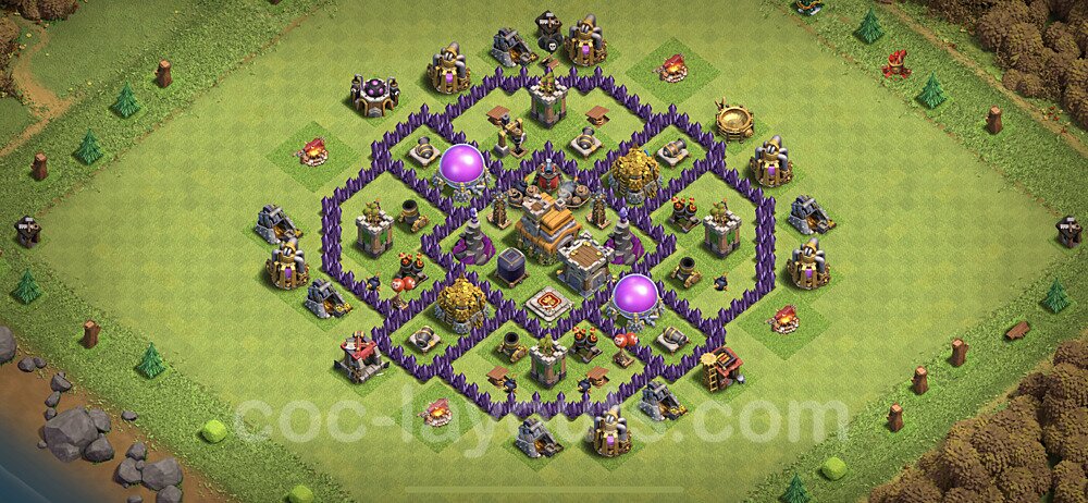 This Town Hall 7 hybrid base offers the best of both worlds - strong resource protection combined with effective trophy defense. The versatile design makes it an excellent choice for players who want to protect their loot while maintaining their trophy count. This balanced approach ensures you don't sacrifice one aspect of defense for another, making it ideal for active players across all league levels. The hybrid layout features centralized resource storages alongside a well-protected Town Hall, with multiple defensive layers that deter both farming raids and trophy pushers. High-value targets are strategically positioned within overlapping defense ranges, forcing attackers to make difficult choices about which objectives to prioritize. The compartmentalized design prevents attackers from easily achieving both loot destruction and the Town Hall kill in a single attack. Defense placement in this hybrid base creates strong coverage against both ground and air attacks. Inferno Towers, X-Bows, and Eagle Artillery work in concert to eliminate threats quickly, while splash damage defenses like Wizard Towers and Bomb Towers counter swarm strategies. The base's funnel-resistant design and strategic trap placement make it effective against popular attack strategies including QC LaLoon (Queen Charge Lava Hound Balloon), Blizzard attacks, and Yeti Smash compositions.