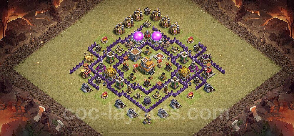 This Town Hall 7 hybrid base offers the best of both worlds - strong resource protection combined with effective trophy defense. The versatile design makes it an excellent choice for players who want to protect their loot while maintaining their trophy count. This balanced approach ensures you don't sacrifice one aspect of defense for another, making it ideal for active players across all league levels. The hybrid layout features centralized resource storages alongside a well-protected Town Hall, with multiple defensive layers that deter both farming raids and trophy pushers. High-value targets are strategically positioned within overlapping defense ranges, forcing attackers to make difficult choices about which objectives to prioritize. The compartmentalized design prevents attackers from easily achieving both loot destruction and the Town Hall kill in a single attack. Defense placement in this hybrid base creates strong coverage against both ground and air attacks. Inferno Towers, X-Bows, and Eagle Artillery work in concert to eliminate threats quickly, while splash damage defenses like Wizard Towers and Bomb Towers counter swarm strategies. The base's funnel-resistant design and strategic trap placement make it effective against popular attack strategies including QC LaLoon (Queen Charge Lava Hound Balloon), Blizzard attacks, and Yeti Smash compositions.