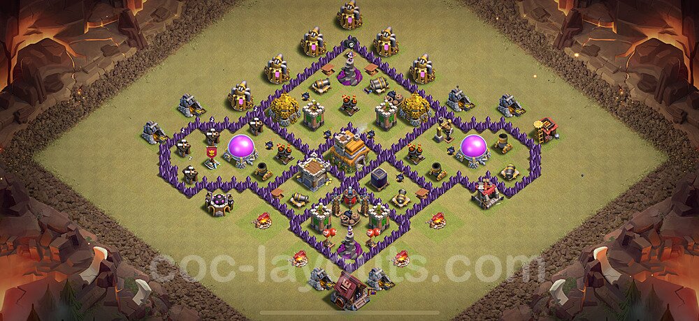 This Town Hall 7 hybrid base offers the best of both worlds - strong resource protection combined with effective trophy defense. The versatile design makes it an excellent choice for players who want to protect their loot while maintaining their trophy count. This balanced approach ensures you don't sacrifice one aspect of defense for another, making it ideal for active players across all league levels. The hybrid layout features centralized resource storages alongside a well-protected Town Hall, with multiple defensive layers that deter both farming raids and trophy pushers. High-value targets are strategically positioned within overlapping defense ranges, forcing attackers to make difficult choices about which objectives to prioritize. The compartmentalized design prevents attackers from easily achieving both loot destruction and the Town Hall kill in a single attack. Defense placement in this hybrid base creates strong coverage against both ground and air attacks. Inferno Towers, X-Bows, and Eagle Artillery work in concert to eliminate threats quickly, while splash damage defenses like Wizard Towers and Bomb Towers counter swarm strategies. The base's funnel-resistant design and strategic trap placement make it effective against popular attack strategies including QC LaLoon (Queen Charge Lava Hound Balloon), Blizzard attacks, and Yeti Smash compositions.