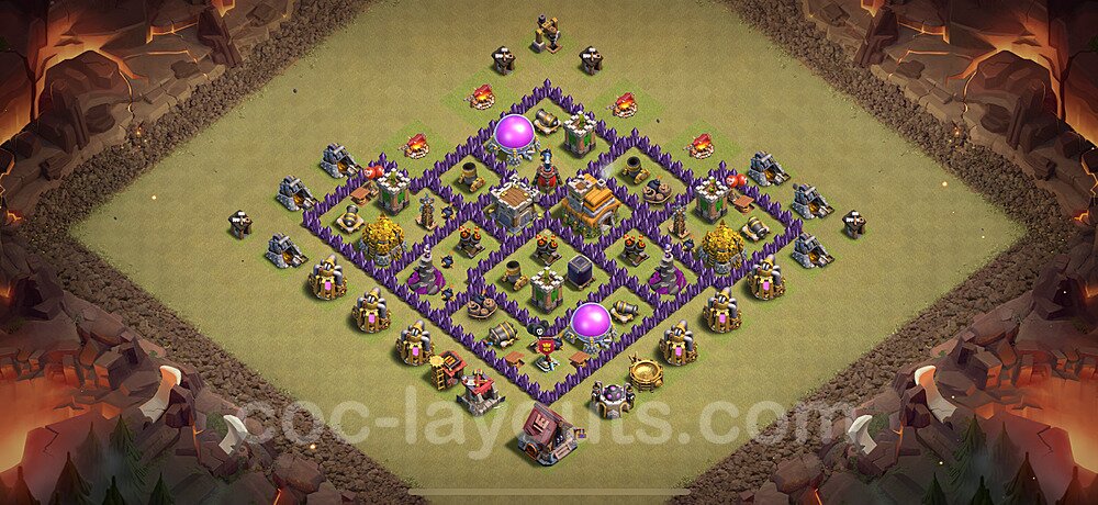 This Town Hall 7 hybrid base offers the best of both worlds - strong resource protection combined with effective trophy defense. The versatile design makes it an excellent choice for players who want to protect their loot while maintaining their trophy count. This balanced approach ensures you don't sacrifice one aspect of defense for another, making it ideal for active players across all league levels. The hybrid layout features centralized resource storages alongside a well-protected Town Hall, with multiple defensive layers that deter both farming raids and trophy pushers. High-value targets are strategically positioned within overlapping defense ranges, forcing attackers to make difficult choices about which objectives to prioritize. The compartmentalized design prevents attackers from easily achieving both loot destruction and the Town Hall kill in a single attack. Defense placement in this hybrid base creates strong coverage against both ground and air attacks. Inferno Towers, X-Bows, and Eagle Artillery work in concert to eliminate threats quickly, while splash damage defenses like Wizard Towers and Bomb Towers counter swarm strategies. The base's funnel-resistant design and strategic trap placement make it effective against popular attack strategies including QC LaLoon (Queen Charge Lava Hound Balloon), Blizzard attacks, and Yeti Smash compositions.