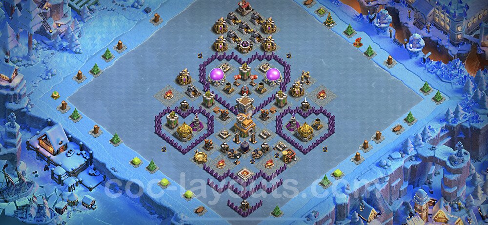 This Town Hall 7 war base is specifically designed to defend against 2-star and 3-star attacks in Clan Wars and Clan War Leagues. The strategic placement of defenses creates multiple compartments that force attackers to use more troops and spells than anticipated. Key defensive structures like Eagle Artillery, Inferno Towers, and X-Bows are positioned to cover crucial sections of the base, making it extremely difficult for opponents to secure a perfect attack. The core of this war base features a centralized Town Hall and Clan Castle, protected by multiple layers of walls and high-damage defenses. This layout forces attackers to commit significant resources just to reach the center, often leaving them without enough firepower to secure the Town Hall destruction. The anti-2-star design ensures that even if attackers breach the outer defenses, they'll struggle to achieve a 50% destruction rating. Air defenses are strategically spread to counter popular air attack strategies like LaLoon (Lava Hound + Balloons) and Electrone (Electro Dragons + Stone Slammer). The symmetrical trap placement and strategic Hidden Tesla positions create deadly surprise elements that can completely derail an attacker's plan. This base has been tested against various meta attack strategies and has consistently proven effective in preventing 3-star attacks.