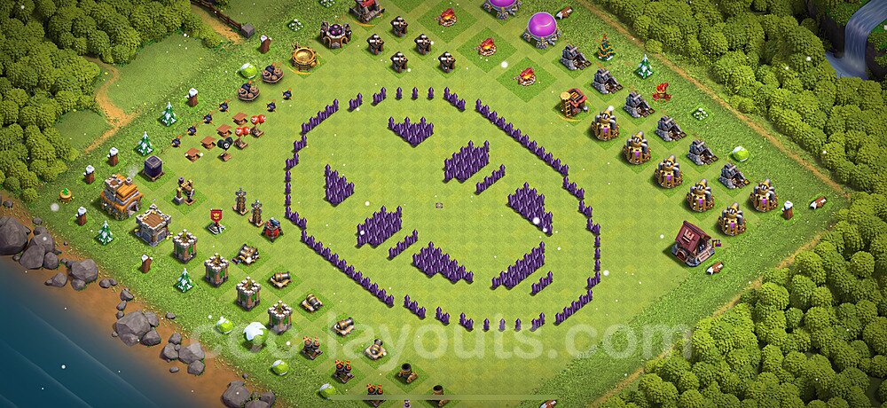 This Town Hall 7 war base is specifically designed to defend against 2-star and 3-star attacks in Clan Wars and Clan War Leagues. The strategic placement of defenses creates multiple compartments that force attackers to use more troops and spells than anticipated. Key defensive structures like Eagle Artillery, Inferno Towers, and X-Bows are positioned to cover crucial sections of the base, making it extremely difficult for opponents to secure a perfect attack. The core of this war base features a centralized Town Hall and Clan Castle, protected by multiple layers of walls and high-damage defenses. This layout forces attackers to commit significant resources just to reach the center, often leaving them without enough firepower to secure the Town Hall destruction. The anti-2-star design ensures that even if attackers breach the outer defenses, they'll struggle to achieve a 50% destruction rating. Air defenses are strategically spread to counter popular air attack strategies like LaLoon (Lava Hound + Balloons) and Electrone (Electro Dragons + Stone Slammer). The symmetrical trap placement and strategic Hidden Tesla positions create deadly surprise elements that can completely derail an attacker's plan. This base has been tested against various meta attack strategies and has consistently proven effective in preventing 3-star attacks.