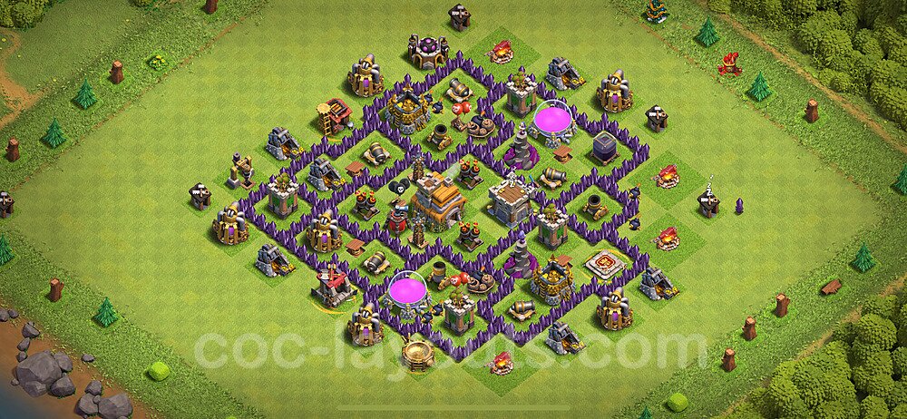 This Town Hall 7 trophy pushing base is engineered for maximum defensive capability to help you climb and maintain higher trophy leagues. The design focuses on preventing attackers from achieving the 50% destruction threshold needed to steal trophies, with a heavily fortified Town Hall position and anti-2-star compartmentalization. This layout is perfect for competitive players aiming to reach Champion, Titan, or Legend League. The strategic placement of defenses creates overlapping coverage that makes it nearly impossible for attackers to access the core without facing devastating firepower. High-DPS defenses like Inferno Towers and Eagle Artillery are positioned to protect the Town Hall from all angles, while splash damage defenses counter mass troop strategies. The anti-air coverage is exceptionally strong, with Air Defenses, Air Sweepers, and Wizard Towers positioned to eliminate aerial threats quickly. Trap placement in this trophy base is optimized to counter popular attack strategies seen in higher leagues. Spring Traps are positioned to eliminate Hog Riders and Valkyries, while Giant Bombs target Balloons and Wall Breakers. The base's asymmetrical design confuses attackers' pathing algorithms, causing troops to split and take unnecessary damage. This layout has been battle-tested in Legend League and has consistently helped players maintain their trophies against skilled attackers.