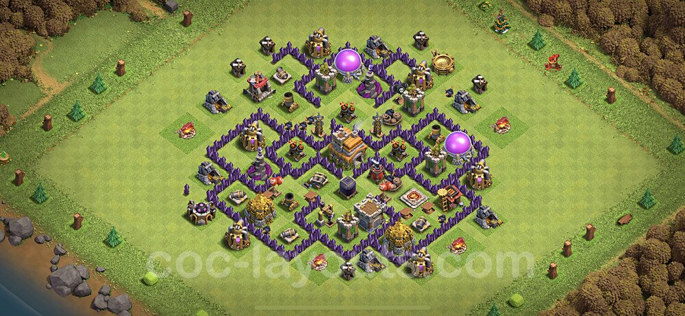This Town Hall 7 trophy pushing base is engineered for maximum defensive capability to help you climb and maintain higher trophy leagues. The design focuses on preventing attackers from achieving the 50% destruction threshold needed to steal trophies, with a heavily fortified Town Hall position and anti-2-star compartmentalization. This layout is perfect for competitive players aiming to reach Champion, Titan, or Legend League. The strategic placement of defenses creates overlapping coverage that makes it nearly impossible for attackers to access the core without facing devastating firepower. High-DPS defenses like Inferno Towers and Eagle Artillery are positioned to protect the Town Hall from all angles, while splash damage defenses counter mass troop strategies. The anti-air coverage is exceptionally strong, with Air Defenses, Air Sweepers, and Wizard Towers positioned to eliminate aerial threats quickly. Trap placement in this trophy base is optimized to counter popular attack strategies seen in higher leagues. Spring Traps are positioned to eliminate Hog Riders and Valkyries, while Giant Bombs target Balloons and Wall Breakers. The base's asymmetrical design confuses attackers' pathing algorithms, causing troops to split and take unnecessary damage. This layout has been battle-tested in Legend League and has consistently helped players maintain their trophies against skilled attackers.