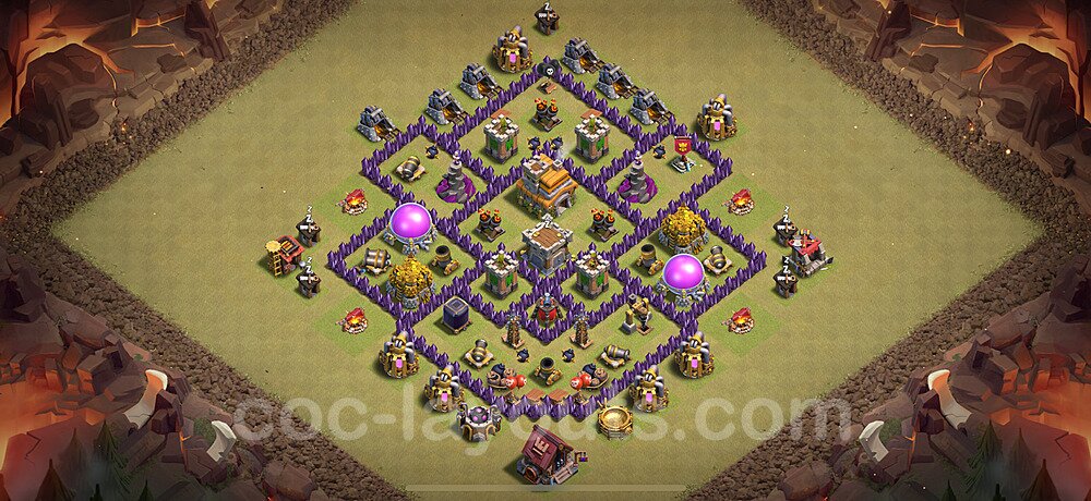 This Town Hall 7 war base is specifically designed to defend against 2-star and 3-star attacks in Clan Wars and Clan War Leagues. The strategic placement of defenses creates multiple compartments that force attackers to use more troops and spells than anticipated. Key defensive structures like Eagle Artillery, Inferno Towers, and X-Bows are positioned to cover crucial sections of the base, making it extremely difficult for opponents to secure a perfect attack. The core of this war base features a centralized Town Hall and Clan Castle, protected by multiple layers of walls and high-damage defenses. This layout forces attackers to commit significant resources just to reach the center, often leaving them without enough firepower to secure the Town Hall destruction. The anti-2-star design ensures that even if attackers breach the outer defenses, they'll struggle to achieve a 50% destruction rating. Air defenses are strategically spread to counter popular air attack strategies like LaLoon (Lava Hound + Balloons) and Electrone (Electro Dragons + Stone Slammer). The symmetrical trap placement and strategic Hidden Tesla positions create deadly surprise elements that can completely derail an attacker's plan. This base has been tested against various meta attack strategies and has consistently proven effective in preventing 3-star attacks.
