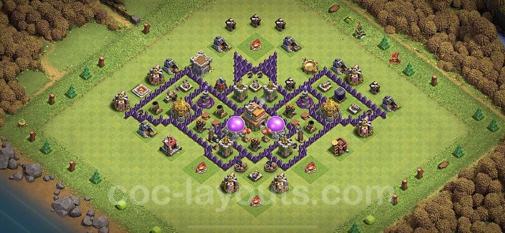 This Town Hall 7 war base is specifically designed to defend against 2-star and 3-star attacks in Clan Wars and Clan War Leagues. The strategic placement of defenses creates multiple compartments that force attackers to use more troops and spells than anticipated. Key defensive structures like Eagle Artillery, Inferno Towers, and X-Bows are positioned to cover crucial sections of the base, making it extremely difficult for opponents to secure a perfect attack. The core of this war base features a centralized Town Hall and Clan Castle, protected by multiple layers of walls and high-damage defenses. This layout forces attackers to commit significant resources just to reach the center, often leaving them without enough firepower to secure the Town Hall destruction. The anti-2-star design ensures that even if attackers breach the outer defenses, they'll struggle to achieve a 50% destruction rating. Air defenses are strategically spread to counter popular air attack strategies like LaLoon (Lava Hound + Balloons) and Electrone (Electro Dragons + Stone Slammer). The symmetrical trap placement and strategic Hidden Tesla positions create deadly surprise elements that can completely derail an attacker's plan. This base has been tested against various meta attack strategies and has consistently proven effective in preventing 3-star attacks.