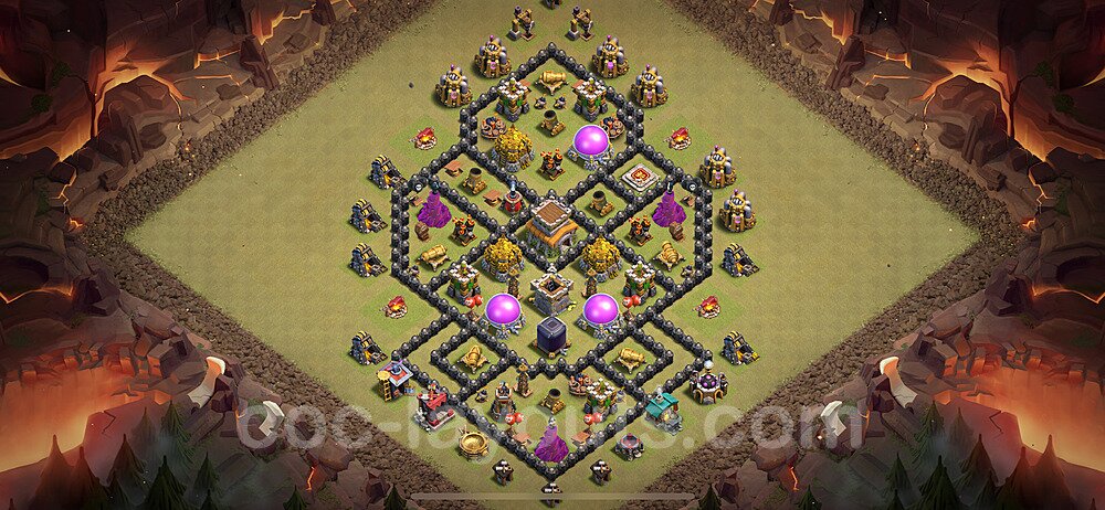 This Town Hall 8 hybrid base offers the best of both worlds - strong resource protection combined with effective trophy defense. The versatile design makes it an excellent choice for players who want to protect their loot while maintaining their trophy count. This balanced approach ensures you don't sacrifice one aspect of defense for another, making it ideal for active players across all league levels. The hybrid layout features centralized resource storages alongside a well-protected Town Hall, with multiple defensive layers that deter both farming raids and trophy pushers. High-value targets are strategically positioned within overlapping defense ranges, forcing attackers to make difficult choices about which objectives to prioritize. The compartmentalized design prevents attackers from easily achieving both loot destruction and the Town Hall kill in a single attack. Defense placement in this hybrid base creates strong coverage against both ground and air attacks. Inferno Towers, X-Bows, and Eagle Artillery work in concert to eliminate threats quickly, while splash damage defenses like Wizard Towers and Bomb Towers counter swarm strategies. The base's funnel-resistant design and strategic trap placement make it effective against popular attack strategies including QC LaLoon (Queen Charge Lava Hound Balloon), Blizzard attacks, and Yeti Smash compositions.