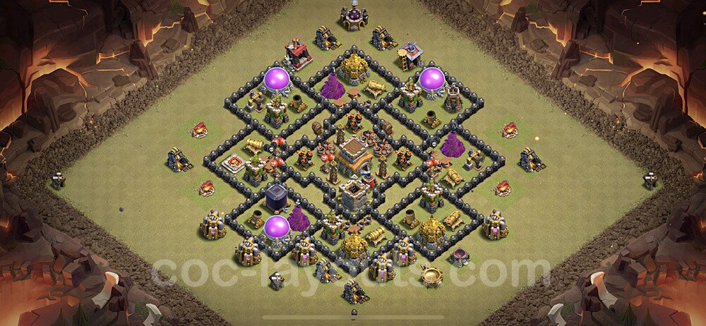 This Town Hall 8 war base is specifically designed to defend against 2-star and 3-star attacks in Clan Wars and Clan War Leagues. The strategic placement of defenses creates multiple compartments that force attackers to use more troops and spells than anticipated. Key defensive structures like Eagle Artillery, Inferno Towers, and X-Bows are positioned to cover crucial sections of the base, making it extremely difficult for opponents to secure a perfect attack. The core of this war base features a centralized Town Hall and Clan Castle, protected by multiple layers of walls and high-damage defenses. This layout forces attackers to commit significant resources just to reach the center, often leaving them without enough firepower to secure the Town Hall destruction. The anti-2-star design ensures that even if attackers breach the outer defenses, they'll struggle to achieve a 50% destruction rating. Air defenses are strategically spread to counter popular air attack strategies like LaLoon (Lava Hound + Balloons) and Electrone (Electro Dragons + Stone Slammer). The symmetrical trap placement and strategic Hidden Tesla positions create deadly surprise elements that can completely derail an attacker's plan. This base has been tested against various meta attack strategies and has consistently proven effective in preventing 3-star attacks.