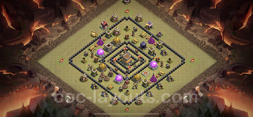 This Town Hall 8 hybrid base offers the best of both worlds - strong resource protection combined with effective trophy defense. The versatile design makes it an excellent choice for players who want to protect their loot while maintaining their trophy count. This balanced approach ensures you don't sacrifice one aspect of defense for another, making it ideal for active players across all league levels. The hybrid layout features centralized resource storages alongside a well-protected Town Hall, with multiple defensive layers that deter both farming raids and trophy pushers. High-value targets are strategically positioned within overlapping defense ranges, forcing attackers to make difficult choices about which objectives to prioritize. The compartmentalized design prevents attackers from easily achieving both loot destruction and the Town Hall kill in a single attack. Defense placement in this hybrid base creates strong coverage against both ground and air attacks. Inferno Towers, X-Bows, and Eagle Artillery work in concert to eliminate threats quickly, while splash damage defenses like Wizard Towers and Bomb Towers counter swarm strategies. The base's funnel-resistant design and strategic trap placement make it effective against popular attack strategies including QC LaLoon (Queen Charge Lava Hound Balloon), Blizzard attacks, and Yeti Smash compositions.