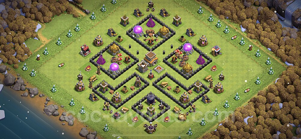 This Town Hall 8 war base is specifically designed to defend against 2-star and 3-star attacks in Clan Wars and Clan War Leagues. The strategic placement of defenses creates multiple compartments that force attackers to use more troops and spells than anticipated. Key defensive structures like Eagle Artillery, Inferno Towers, and X-Bows are positioned to cover crucial sections of the base, making it extremely difficult for opponents to secure a perfect attack. The core of this war base features a centralized Town Hall and Clan Castle, protected by multiple layers of walls and high-damage defenses. This layout forces attackers to commit significant resources just to reach the center, often leaving them without enough firepower to secure the Town Hall destruction. The anti-2-star design ensures that even if attackers breach the outer defenses, they'll struggle to achieve a 50% destruction rating. Air defenses are strategically spread to counter popular air attack strategies like LaLoon (Lava Hound + Balloons) and Electrone (Electro Dragons + Stone Slammer). The symmetrical trap placement and strategic Hidden Tesla positions create deadly surprise elements that can completely derail an attacker's plan. This base has been tested against various meta attack strategies and has consistently proven effective in preventing 3-star attacks.
