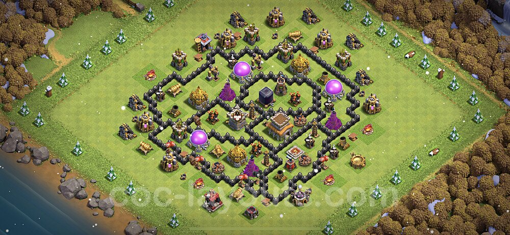 This Town Hall 8 hybrid base offers the best of both worlds - strong resource protection combined with effective trophy defense. The versatile design makes it an excellent choice for players who want to protect their loot while maintaining their trophy count. This balanced approach ensures you don't sacrifice one aspect of defense for another, making it ideal for active players across all league levels. The hybrid layout features centralized resource storages alongside a well-protected Town Hall, with multiple defensive layers that deter both farming raids and trophy pushers. High-value targets are strategically positioned within overlapping defense ranges, forcing attackers to make difficult choices about which objectives to prioritize. The compartmentalized design prevents attackers from easily achieving both loot destruction and the Town Hall kill in a single attack. Defense placement in this hybrid base creates strong coverage against both ground and air attacks. Inferno Towers, X-Bows, and Eagle Artillery work in concert to eliminate threats quickly, while splash damage defenses like Wizard Towers and Bomb Towers counter swarm strategies. The base's funnel-resistant design and strategic trap placement make it effective against popular attack strategies including QC LaLoon (Queen Charge Lava Hound Balloon), Blizzard attacks, and Yeti Smash compositions.