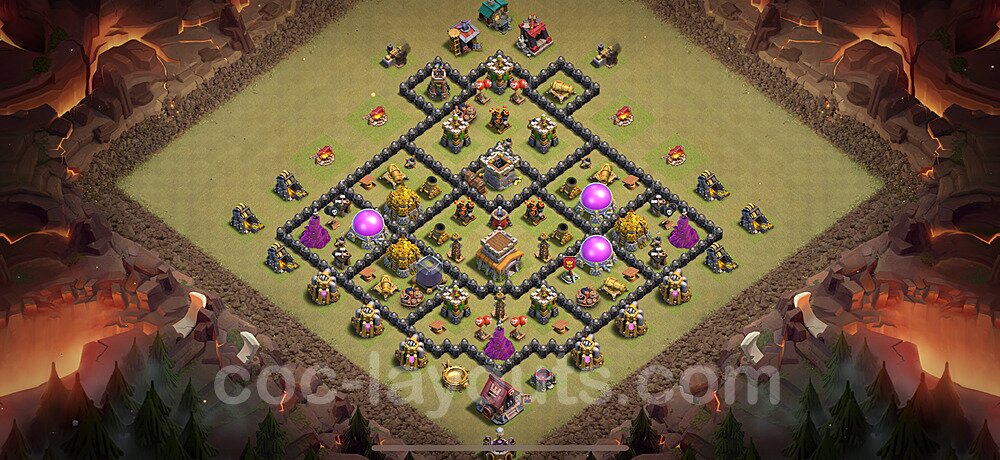 This Town Hall 8 hybrid base offers the best of both worlds - strong resource protection combined with effective trophy defense. The versatile design makes it an excellent choice for players who want to protect their loot while maintaining their trophy count. This balanced approach ensures you don't sacrifice one aspect of defense for another, making it ideal for active players across all league levels. The hybrid layout features centralized resource storages alongside a well-protected Town Hall, with multiple defensive layers that deter both farming raids and trophy pushers. High-value targets are strategically positioned within overlapping defense ranges, forcing attackers to make difficult choices about which objectives to prioritize. The compartmentalized design prevents attackers from easily achieving both loot destruction and the Town Hall kill in a single attack. Defense placement in this hybrid base creates strong coverage against both ground and air attacks. Inferno Towers, X-Bows, and Eagle Artillery work in concert to eliminate threats quickly, while splash damage defenses like Wizard Towers and Bomb Towers counter swarm strategies. The base's funnel-resistant design and strategic trap placement make it effective against popular attack strategies including QC LaLoon (Queen Charge Lava Hound Balloon), Blizzard attacks, and Yeti Smash compositions.