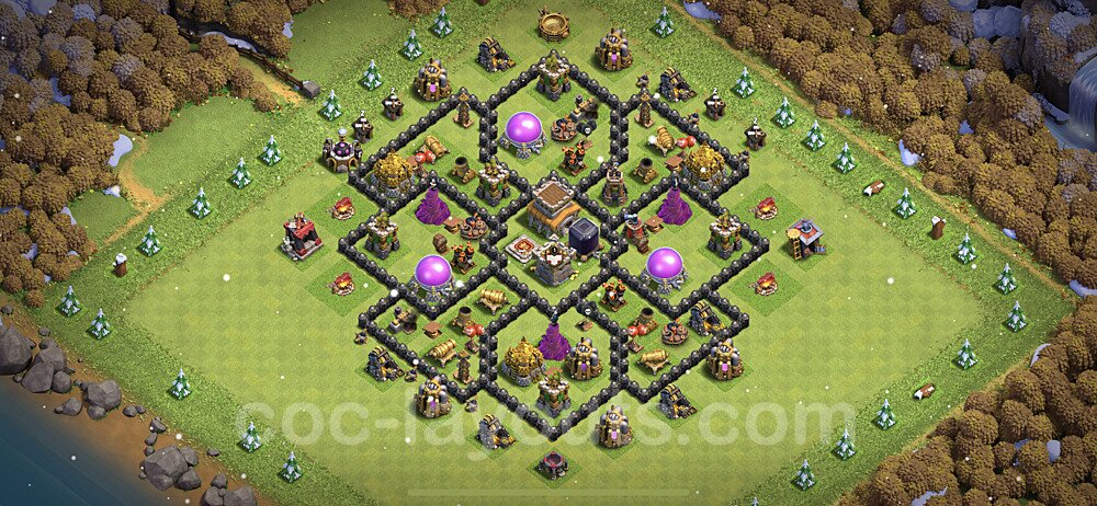 This Town Hall 8 hybrid base offers the best of both worlds - strong resource protection combined with effective trophy defense. The versatile design makes it an excellent choice for players who want to protect their loot while maintaining their trophy count. This balanced approach ensures you don't sacrifice one aspect of defense for another, making it ideal for active players across all league levels. The hybrid layout features centralized resource storages alongside a well-protected Town Hall, with multiple defensive layers that deter both farming raids and trophy pushers. High-value targets are strategically positioned within overlapping defense ranges, forcing attackers to make difficult choices about which objectives to prioritize. The compartmentalized design prevents attackers from easily achieving both loot destruction and the Town Hall kill in a single attack. Defense placement in this hybrid base creates strong coverage against both ground and air attacks. Inferno Towers, X-Bows, and Eagle Artillery work in concert to eliminate threats quickly, while splash damage defenses like Wizard Towers and Bomb Towers counter swarm strategies. The base's funnel-resistant design and strategic trap placement make it effective against popular attack strategies including QC LaLoon (Queen Charge Lava Hound Balloon), Blizzard attacks, and Yeti Smash compositions.
