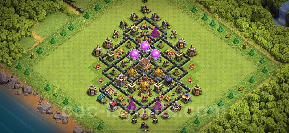 This Town Hall 8 hybrid base offers the best of both worlds - strong resource protection combined with effective trophy defense. The versatile design makes it an excellent choice for players who want to protect their loot while maintaining their trophy count. This balanced approach ensures you don't sacrifice one aspect of defense for another, making it ideal for active players across all league levels. The hybrid layout features centralized resource storages alongside a well-protected Town Hall, with multiple defensive layers that deter both farming raids and trophy pushers. High-value targets are strategically positioned within overlapping defense ranges, forcing attackers to make difficult choices about which objectives to prioritize. The compartmentalized design prevents attackers from easily achieving both loot destruction and the Town Hall kill in a single attack. Defense placement in this hybrid base creates strong coverage against both ground and air attacks. Inferno Towers, X-Bows, and Eagle Artillery work in concert to eliminate threats quickly, while splash damage defenses like Wizard Towers and Bomb Towers counter swarm strategies. The base's funnel-resistant design and strategic trap placement make it effective against popular attack strategies including QC LaLoon (Queen Charge Lava Hound Balloon), Blizzard attacks, and Yeti Smash compositions.