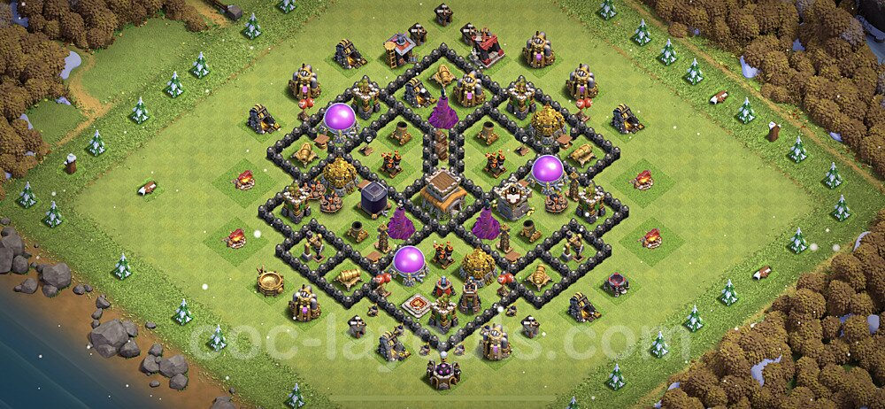 This Town Hall 8 farming base is optimized to protect your resources including Gold, Elixir, and Dark Elixir from raiders. The layout features centralized storages with multiple compartments that make it extremely difficult for attackers to steal large amounts of resources in a single raid. This design philosophy prioritizes resource protection over trophies, making it ideal for players focused on upgrading their village. The strategic placement of resource storages ensures they are well-protected by high-damage defenses like X-Bows, Inferno Towers, and Eagle Artillery. Each storage is surrounded by multiple wall layers and defensive structures, forcing attackers to invest heavily in troops and spells to reach your loot. The farming base design also incorporates strategic dead zones where attackers' troops tend to path inefficiently, wasting time and taking heavy damage from nearby defenses. Collectors and mines are positioned on the outer edges as "bait" while your main storages remain heavily protected in the core. This layout has proven effective against common farming strategies like BARCH (Barbarians + Archers), GoWiPe (Golems + Wizards + Pekka), and mass Miner attacks. The compartmentalized design prevents attackers from funneling straight to your resources, ensuring you maintain your hard-earned loot for important upgrades.
