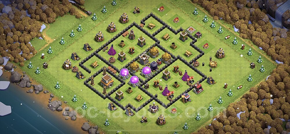This Town Hall 8 farming base is optimized to protect your resources including Gold, Elixir, and Dark Elixir from raiders. The layout features centralized storages with multiple compartments that make it extremely difficult for attackers to steal large amounts of resources in a single raid. This design philosophy prioritizes resource protection over trophies, making it ideal for players focused on upgrading their village. The strategic placement of resource storages ensures they are well-protected by high-damage defenses like X-Bows, Inferno Towers, and Eagle Artillery. Each storage is surrounded by multiple wall layers and defensive structures, forcing attackers to invest heavily in troops and spells to reach your loot. The farming base design also incorporates strategic dead zones where attackers' troops tend to path inefficiently, wasting time and taking heavy damage from nearby defenses. Collectors and mines are positioned on the outer edges as "bait" while your main storages remain heavily protected in the core. This layout has proven effective against common farming strategies like BARCH (Barbarians + Archers), GoWiPe (Golems + Wizards + Pekka), and mass Miner attacks. The compartmentalized design prevents attackers from funneling straight to your resources, ensuring you maintain your hard-earned loot for important upgrades.