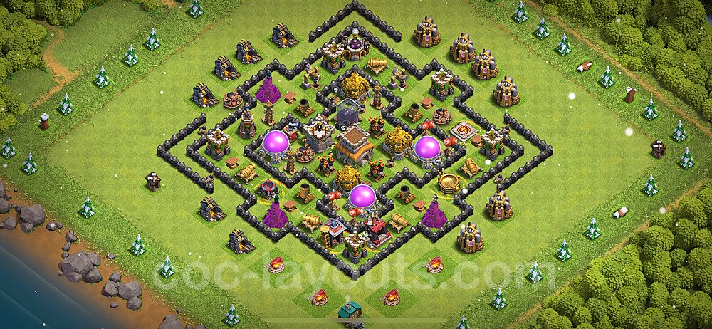 This Town Hall 8 farming base is optimized to protect your resources including Gold, Elixir, and Dark Elixir from raiders. The layout features centralized storages with multiple compartments that make it extremely difficult for attackers to steal large amounts of resources in a single raid. This design philosophy prioritizes resource protection over trophies, making it ideal for players focused on upgrading their village. The strategic placement of resource storages ensures they are well-protected by high-damage defenses like X-Bows, Inferno Towers, and Eagle Artillery. Each storage is surrounded by multiple wall layers and defensive structures, forcing attackers to invest heavily in troops and spells to reach your loot. The farming base design also incorporates strategic dead zones where attackers' troops tend to path inefficiently, wasting time and taking heavy damage from nearby defenses. Collectors and mines are positioned on the outer edges as "bait" while your main storages remain heavily protected in the core. This layout has proven effective against common farming strategies like BARCH (Barbarians + Archers), GoWiPe (Golems + Wizards + Pekka), and mass Miner attacks. The compartmentalized design prevents attackers from funneling straight to your resources, ensuring you maintain your hard-earned loot for important upgrades.