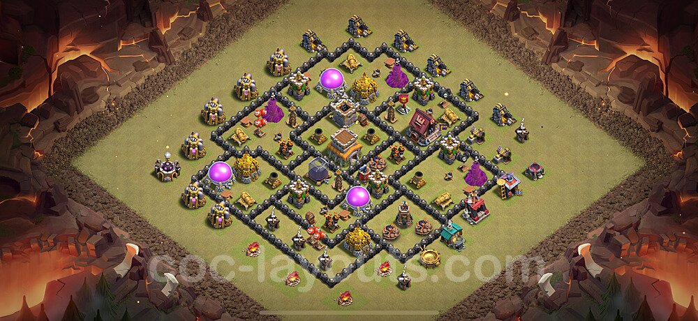 This Town Hall 8 hybrid base offers the best of both worlds - strong resource protection combined with effective trophy defense. The versatile design makes it an excellent choice for players who want to protect their loot while maintaining their trophy count. This balanced approach ensures you don't sacrifice one aspect of defense for another, making it ideal for active players across all league levels. The hybrid layout features centralized resource storages alongside a well-protected Town Hall, with multiple defensive layers that deter both farming raids and trophy pushers. High-value targets are strategically positioned within overlapping defense ranges, forcing attackers to make difficult choices about which objectives to prioritize. The compartmentalized design prevents attackers from easily achieving both loot destruction and the Town Hall kill in a single attack. Defense placement in this hybrid base creates strong coverage against both ground and air attacks. Inferno Towers, X-Bows, and Eagle Artillery work in concert to eliminate threats quickly, while splash damage defenses like Wizard Towers and Bomb Towers counter swarm strategies. The base's funnel-resistant design and strategic trap placement make it effective against popular attack strategies including QC LaLoon (Queen Charge Lava Hound Balloon), Blizzard attacks, and Yeti Smash compositions.