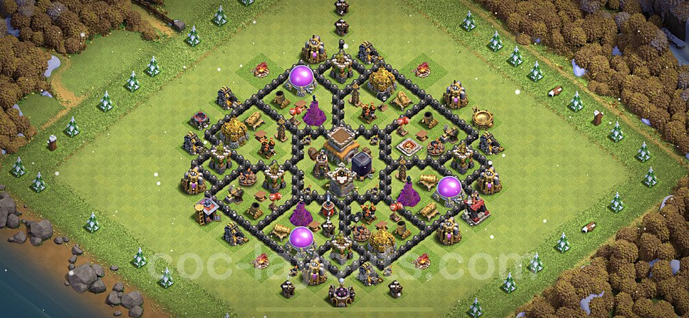 This Town Hall 8 hybrid base offers the best of both worlds - strong resource protection combined with effective trophy defense. The versatile design makes it an excellent choice for players who want to protect their loot while maintaining their trophy count. This balanced approach ensures you don't sacrifice one aspect of defense for another, making it ideal for active players across all league levels. The hybrid layout features centralized resource storages alongside a well-protected Town Hall, with multiple defensive layers that deter both farming raids and trophy pushers. High-value targets are strategically positioned within overlapping defense ranges, forcing attackers to make difficult choices about which objectives to prioritize. The compartmentalized design prevents attackers from easily achieving both loot destruction and the Town Hall kill in a single attack. Defense placement in this hybrid base creates strong coverage against both ground and air attacks. Inferno Towers, X-Bows, and Eagle Artillery work in concert to eliminate threats quickly, while splash damage defenses like Wizard Towers and Bomb Towers counter swarm strategies. The base's funnel-resistant design and strategic trap placement make it effective against popular attack strategies including QC LaLoon (Queen Charge Lava Hound Balloon), Blizzard attacks, and Yeti Smash compositions.