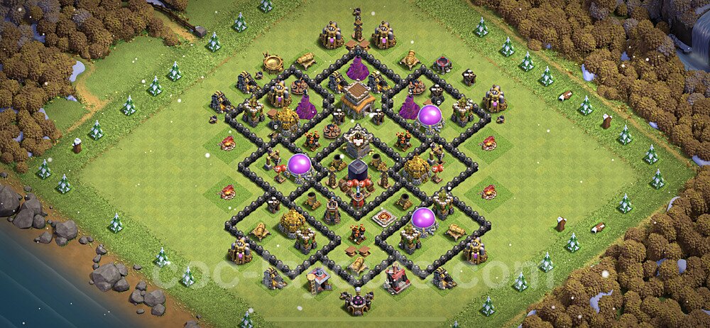 This Town Hall 8 hybrid base offers the best of both worlds - strong resource protection combined with effective trophy defense. The versatile design makes it an excellent choice for players who want to protect their loot while maintaining their trophy count. This balanced approach ensures you don't sacrifice one aspect of defense for another, making it ideal for active players across all league levels. The hybrid layout features centralized resource storages alongside a well-protected Town Hall, with multiple defensive layers that deter both farming raids and trophy pushers. High-value targets are strategically positioned within overlapping defense ranges, forcing attackers to make difficult choices about which objectives to prioritize. The compartmentalized design prevents attackers from easily achieving both loot destruction and the Town Hall kill in a single attack. Defense placement in this hybrid base creates strong coverage against both ground and air attacks. Inferno Towers, X-Bows, and Eagle Artillery work in concert to eliminate threats quickly, while splash damage defenses like Wizard Towers and Bomb Towers counter swarm strategies. The base's funnel-resistant design and strategic trap placement make it effective against popular attack strategies including QC LaLoon (Queen Charge Lava Hound Balloon), Blizzard attacks, and Yeti Smash compositions.