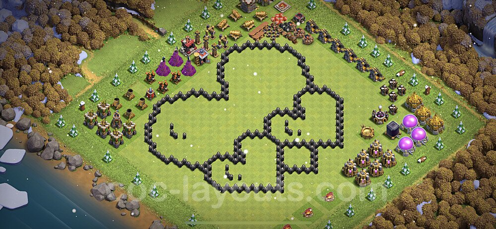 This Town Hall 8 war base is specifically designed to defend against 2-star and 3-star attacks in Clan Wars and Clan War Leagues. The strategic placement of defenses creates multiple compartments that force attackers to use more troops and spells than anticipated. Key defensive structures like Eagle Artillery, Inferno Towers, and X-Bows are positioned to cover crucial sections of the base, making it extremely difficult for opponents to secure a perfect attack. The core of this war base features a centralized Town Hall and Clan Castle, protected by multiple layers of walls and high-damage defenses. This layout forces attackers to commit significant resources just to reach the center, often leaving them without enough firepower to secure the Town Hall destruction. The anti-2-star design ensures that even if attackers breach the outer defenses, they'll struggle to achieve a 50% destruction rating. Air defenses are strategically spread to counter popular air attack strategies like LaLoon (Lava Hound + Balloons) and Electrone (Electro Dragons + Stone Slammer). The symmetrical trap placement and strategic Hidden Tesla positions create deadly surprise elements that can completely derail an attacker's plan. This base has been tested against various meta attack strategies and has consistently proven effective in preventing 3-star attacks.