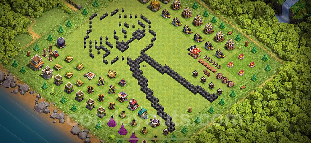 This Town Hall 8 war base is specifically designed to defend against 2-star and 3-star attacks in Clan Wars and Clan War Leagues. The strategic placement of defenses creates multiple compartments that force attackers to use more troops and spells than anticipated. Key defensive structures like Eagle Artillery, Inferno Towers, and X-Bows are positioned to cover crucial sections of the base, making it extremely difficult for opponents to secure a perfect attack. The core of this war base features a centralized Town Hall and Clan Castle, protected by multiple layers of walls and high-damage defenses. This layout forces attackers to commit significant resources just to reach the center, often leaving them without enough firepower to secure the Town Hall destruction. The anti-2-star design ensures that even if attackers breach the outer defenses, they'll struggle to achieve a 50% destruction rating. Air defenses are strategically spread to counter popular air attack strategies like LaLoon (Lava Hound + Balloons) and Electrone (Electro Dragons + Stone Slammer). The symmetrical trap placement and strategic Hidden Tesla positions create deadly surprise elements that can completely derail an attacker's plan. This base has been tested against various meta attack strategies and has consistently proven effective in preventing 3-star attacks.