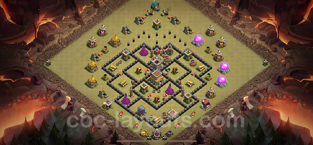 This Town Hall 8 war base is specifically designed to defend against 2-star and 3-star attacks in Clan Wars and Clan War Leagues. The strategic placement of defenses creates multiple compartments that force attackers to use more troops and spells than anticipated. Key defensive structures like Eagle Artillery, Inferno Towers, and X-Bows are positioned to cover crucial sections of the base, making it extremely difficult for opponents to secure a perfect attack. The core of this war base features a centralized Town Hall and Clan Castle, protected by multiple layers of walls and high-damage defenses. This layout forces attackers to commit significant resources just to reach the center, often leaving them without enough firepower to secure the Town Hall destruction. The anti-2-star design ensures that even if attackers breach the outer defenses, they'll struggle to achieve a 50% destruction rating. Air defenses are strategically spread to counter popular air attack strategies like LaLoon (Lava Hound + Balloons) and Electrone (Electro Dragons + Stone Slammer). The symmetrical trap placement and strategic Hidden Tesla positions create deadly surprise elements that can completely derail an attacker's plan. This base has been tested against various meta attack strategies and has consistently proven effective in preventing 3-star attacks.