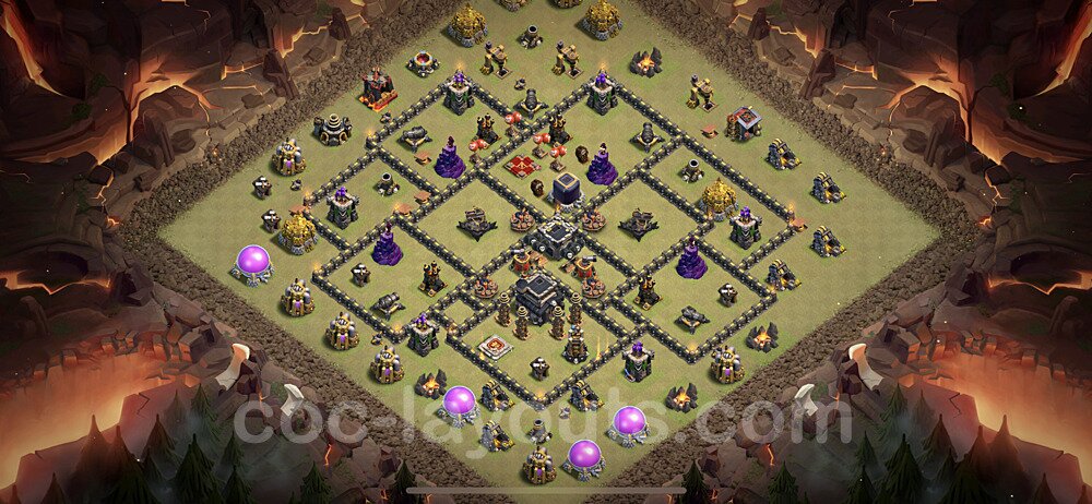 This Town Hall 9 war base is specifically designed to defend against 2-star and 3-star attacks in Clan Wars and Clan War Leagues. The strategic placement of defenses creates multiple compartments that force attackers to use more troops and spells than anticipated. Key defensive structures like Eagle Artillery, Inferno Towers, and X-Bows are positioned to cover crucial sections of the base, making it extremely difficult for opponents to secure a perfect attack. The core of this war base features a centralized Town Hall and Clan Castle, protected by multiple layers of walls and high-damage defenses. This layout forces attackers to commit significant resources just to reach the center, often leaving them without enough firepower to secure the Town Hall destruction. The anti-2-star design ensures that even if attackers breach the outer defenses, they'll struggle to achieve a 50% destruction rating. Air defenses are strategically spread to counter popular air attack strategies like LaLoon (Lava Hound + Balloons) and Electrone (Electro Dragons + Stone Slammer). The symmetrical trap placement and strategic Hidden Tesla positions create deadly surprise elements that can completely derail an attacker's plan. This base has been tested against various meta attack strategies and has consistently proven effective in preventing 3-star attacks.