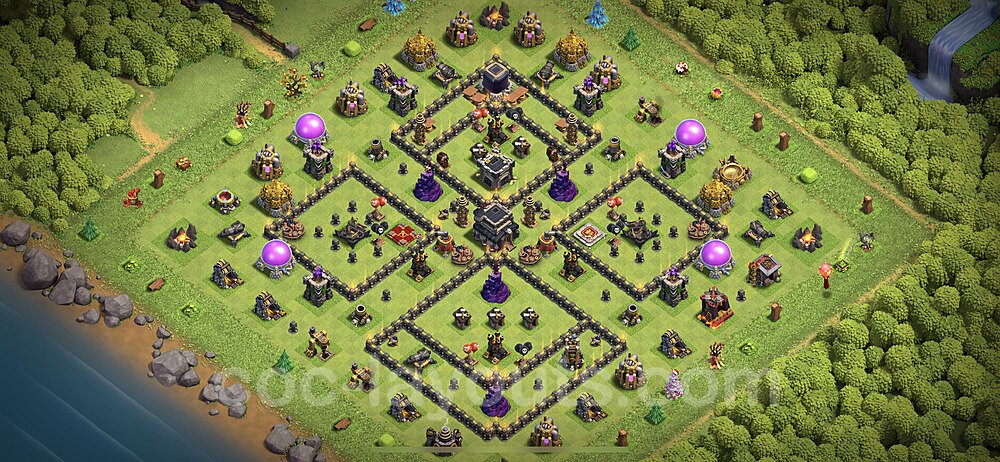This Town Hall 9 war base is specifically designed to defend against 2-star and 3-star attacks in Clan Wars and Clan War Leagues. The strategic placement of defenses creates multiple compartments that force attackers to use more troops and spells than anticipated. Key defensive structures like Eagle Artillery, Inferno Towers, and X-Bows are positioned to cover crucial sections of the base, making it extremely difficult for opponents to secure a perfect attack. The core of this war base features a centralized Town Hall and Clan Castle, protected by multiple layers of walls and high-damage defenses. This layout forces attackers to commit significant resources just to reach the center, often leaving them without enough firepower to secure the Town Hall destruction. The anti-2-star design ensures that even if attackers breach the outer defenses, they'll struggle to achieve a 50% destruction rating. Air defenses are strategically spread to counter popular air attack strategies like LaLoon (Lava Hound + Balloons) and Electrone (Electro Dragons + Stone Slammer). The symmetrical trap placement and strategic Hidden Tesla positions create deadly surprise elements that can completely derail an attacker's plan. This base has been tested against various meta attack strategies and has consistently proven effective in preventing 3-star attacks.