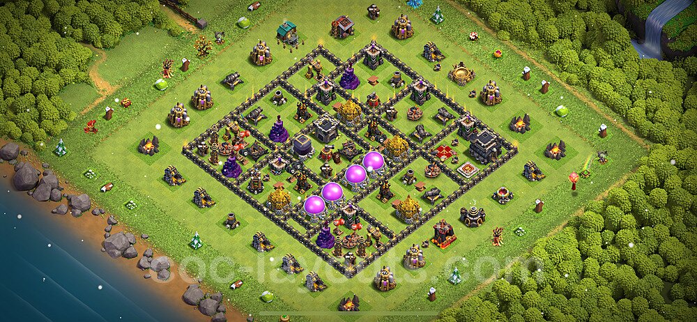 This Town Hall 9 hybrid base offers the best of both worlds - strong resource protection combined with effective trophy defense. The versatile design makes it an excellent choice for players who want to protect their loot while maintaining their trophy count. This balanced approach ensures you don't sacrifice one aspect of defense for another, making it ideal for active players across all league levels. The hybrid layout features centralized resource storages alongside a well-protected Town Hall, with multiple defensive layers that deter both farming raids and trophy pushers. High-value targets are strategically positioned within overlapping defense ranges, forcing attackers to make difficult choices about which objectives to prioritize. The compartmentalized design prevents attackers from easily achieving both loot destruction and the Town Hall kill in a single attack. Defense placement in this hybrid base creates strong coverage against both ground and air attacks. Inferno Towers, X-Bows, and Eagle Artillery work in concert to eliminate threats quickly, while splash damage defenses like Wizard Towers and Bomb Towers counter swarm strategies. The base's funnel-resistant design and strategic trap placement make it effective against popular attack strategies including QC LaLoon (Queen Charge Lava Hound Balloon), Blizzard attacks, and Yeti Smash compositions.