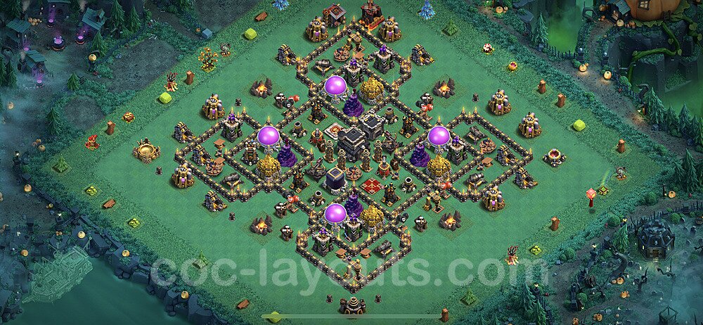 This Town Hall 9 hybrid base offers the best of both worlds - strong resource protection combined with effective trophy defense. The versatile design makes it an excellent choice for players who want to protect their loot while maintaining their trophy count. This balanced approach ensures you don't sacrifice one aspect of defense for another, making it ideal for active players across all league levels. The hybrid layout features centralized resource storages alongside a well-protected Town Hall, with multiple defensive layers that deter both farming raids and trophy pushers. High-value targets are strategically positioned within overlapping defense ranges, forcing attackers to make difficult choices about which objectives to prioritize. The compartmentalized design prevents attackers from easily achieving both loot destruction and the Town Hall kill in a single attack. Defense placement in this hybrid base creates strong coverage against both ground and air attacks. Inferno Towers, X-Bows, and Eagle Artillery work in concert to eliminate threats quickly, while splash damage defenses like Wizard Towers and Bomb Towers counter swarm strategies. The base's funnel-resistant design and strategic trap placement make it effective against popular attack strategies including QC LaLoon (Queen Charge Lava Hound Balloon), Blizzard attacks, and Yeti Smash compositions.
