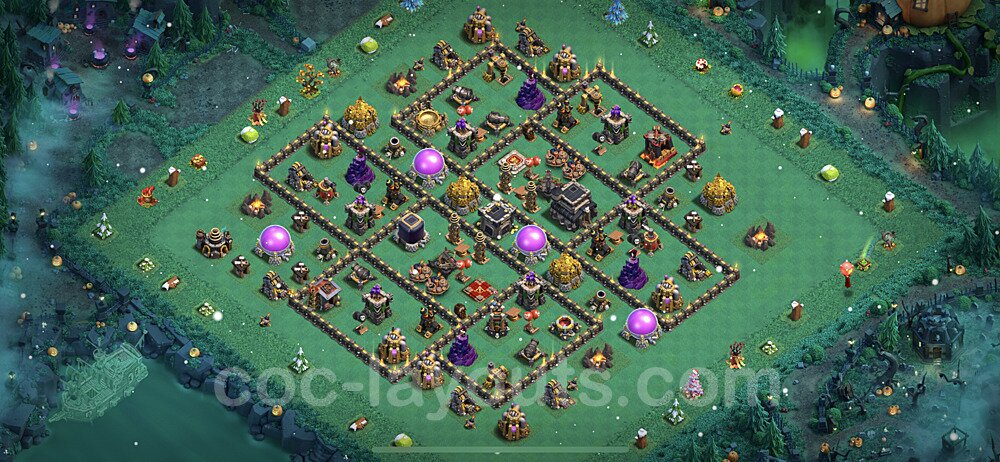 This Town Hall 9 hybrid base offers the best of both worlds - strong resource protection combined with effective trophy defense. The versatile design makes it an excellent choice for players who want to protect their loot while maintaining their trophy count. This balanced approach ensures you don't sacrifice one aspect of defense for another, making it ideal for active players across all league levels. The hybrid layout features centralized resource storages alongside a well-protected Town Hall, with multiple defensive layers that deter both farming raids and trophy pushers. High-value targets are strategically positioned within overlapping defense ranges, forcing attackers to make difficult choices about which objectives to prioritize. The compartmentalized design prevents attackers from easily achieving both loot destruction and the Town Hall kill in a single attack. Defense placement in this hybrid base creates strong coverage against both ground and air attacks. Inferno Towers, X-Bows, and Eagle Artillery work in concert to eliminate threats quickly, while splash damage defenses like Wizard Towers and Bomb Towers counter swarm strategies. The base's funnel-resistant design and strategic trap placement make it effective against popular attack strategies including QC LaLoon (Queen Charge Lava Hound Balloon), Blizzard attacks, and Yeti Smash compositions.