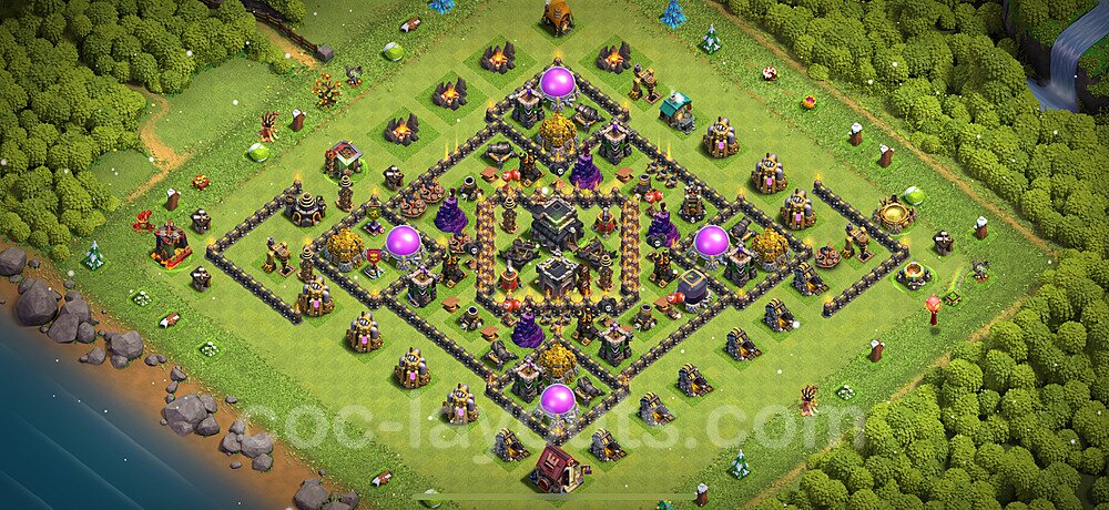 This Town Hall 9 hybrid base offers the best of both worlds - strong resource protection combined with effective trophy defense. The versatile design makes it an excellent choice for players who want to protect their loot while maintaining their trophy count. This balanced approach ensures you don't sacrifice one aspect of defense for another, making it ideal for active players across all league levels. The hybrid layout features centralized resource storages alongside a well-protected Town Hall, with multiple defensive layers that deter both farming raids and trophy pushers. High-value targets are strategically positioned within overlapping defense ranges, forcing attackers to make difficult choices about which objectives to prioritize. The compartmentalized design prevents attackers from easily achieving both loot destruction and the Town Hall kill in a single attack. Defense placement in this hybrid base creates strong coverage against both ground and air attacks. Inferno Towers, X-Bows, and Eagle Artillery work in concert to eliminate threats quickly, while splash damage defenses like Wizard Towers and Bomb Towers counter swarm strategies. The base's funnel-resistant design and strategic trap placement make it effective against popular attack strategies including QC LaLoon (Queen Charge Lava Hound Balloon), Blizzard attacks, and Yeti Smash compositions.