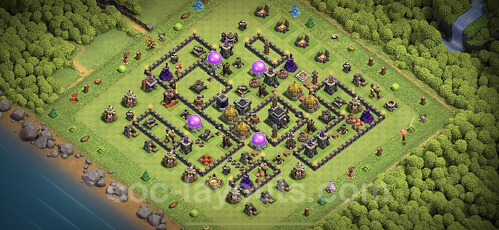 This Town Hall 9 hybrid base offers the best of both worlds - strong resource protection combined with effective trophy defense. The versatile design makes it an excellent choice for players who want to protect their loot while maintaining their trophy count. This balanced approach ensures you don't sacrifice one aspect of defense for another, making it ideal for active players across all league levels. The hybrid layout features centralized resource storages alongside a well-protected Town Hall, with multiple defensive layers that deter both farming raids and trophy pushers. High-value targets are strategically positioned within overlapping defense ranges, forcing attackers to make difficult choices about which objectives to prioritize. The compartmentalized design prevents attackers from easily achieving both loot destruction and the Town Hall kill in a single attack. Defense placement in this hybrid base creates strong coverage against both ground and air attacks. Inferno Towers, X-Bows, and Eagle Artillery work in concert to eliminate threats quickly, while splash damage defenses like Wizard Towers and Bomb Towers counter swarm strategies. The base's funnel-resistant design and strategic trap placement make it effective against popular attack strategies including QC LaLoon (Queen Charge Lava Hound Balloon), Blizzard attacks, and Yeti Smash compositions.