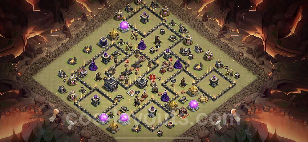 This Town Hall 9 war base is specifically designed to defend against 2-star and 3-star attacks in Clan Wars and Clan War Leagues. The strategic placement of defenses creates multiple compartments that force attackers to use more troops and spells than anticipated. Key defensive structures like Eagle Artillery, Inferno Towers, and X-Bows are positioned to cover crucial sections of the base, making it extremely difficult for opponents to secure a perfect attack. The core of this war base features a centralized Town Hall and Clan Castle, protected by multiple layers of walls and high-damage defenses. This layout forces attackers to commit significant resources just to reach the center, often leaving them without enough firepower to secure the Town Hall destruction. The anti-2-star design ensures that even if attackers breach the outer defenses, they'll struggle to achieve a 50% destruction rating. Air defenses are strategically spread to counter popular air attack strategies like LaLoon (Lava Hound + Balloons) and Electrone (Electro Dragons + Stone Slammer). The symmetrical trap placement and strategic Hidden Tesla positions create deadly surprise elements that can completely derail an attacker's plan. This base has been tested against various meta attack strategies and has consistently proven effective in preventing 3-star attacks.