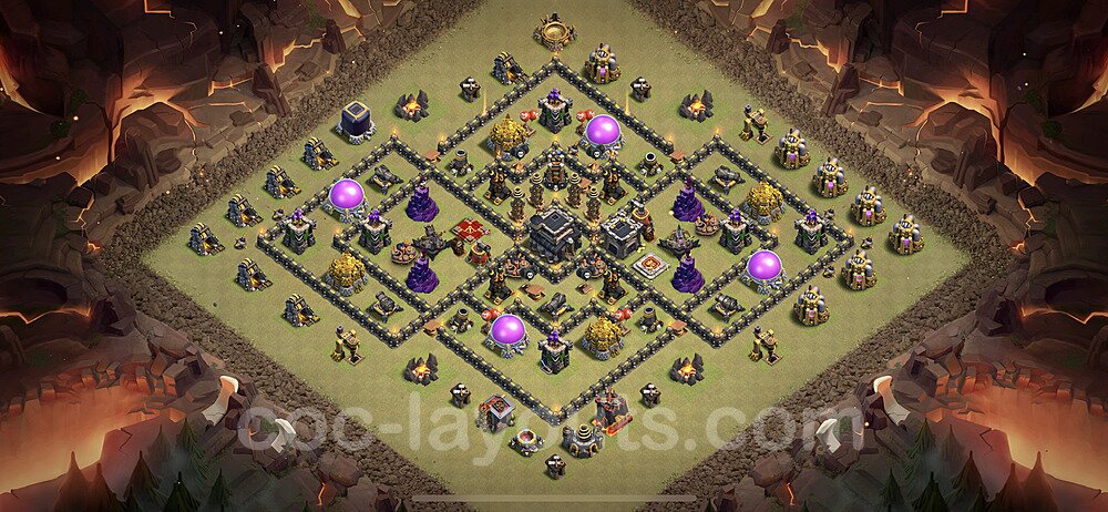 This Town Hall 9 war base is specifically designed to defend against 2-star and 3-star attacks in Clan Wars and Clan War Leagues. The strategic placement of defenses creates multiple compartments that force attackers to use more troops and spells than anticipated. Key defensive structures like Eagle Artillery, Inferno Towers, and X-Bows are positioned to cover crucial sections of the base, making it extremely difficult for opponents to secure a perfect attack. The core of this war base features a centralized Town Hall and Clan Castle, protected by multiple layers of walls and high-damage defenses. This layout forces attackers to commit significant resources just to reach the center, often leaving them without enough firepower to secure the Town Hall destruction. The anti-2-star design ensures that even if attackers breach the outer defenses, they'll struggle to achieve a 50% destruction rating. Air defenses are strategically spread to counter popular air attack strategies like LaLoon (Lava Hound + Balloons) and Electrone (Electro Dragons + Stone Slammer). The symmetrical trap placement and strategic Hidden Tesla positions create deadly surprise elements that can completely derail an attacker's plan. This base has been tested against various meta attack strategies and has consistently proven effective in preventing 3-star attacks.