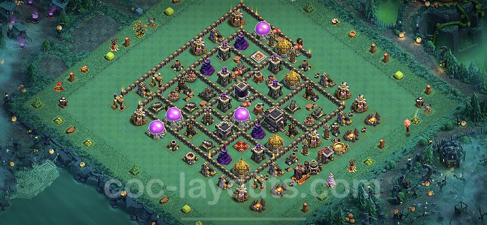 This Town Hall 9 war base is specifically designed to defend against 2-star and 3-star attacks in Clan Wars and Clan War Leagues. The strategic placement of defenses creates multiple compartments that force attackers to use more troops and spells than anticipated. Key defensive structures like Eagle Artillery, Inferno Towers, and X-Bows are positioned to cover crucial sections of the base, making it extremely difficult for opponents to secure a perfect attack. The core of this war base features a centralized Town Hall and Clan Castle, protected by multiple layers of walls and high-damage defenses. This layout forces attackers to commit significant resources just to reach the center, often leaving them without enough firepower to secure the Town Hall destruction. The anti-2-star design ensures that even if attackers breach the outer defenses, they'll struggle to achieve a 50% destruction rating. Air defenses are strategically spread to counter popular air attack strategies like LaLoon (Lava Hound + Balloons) and Electrone (Electro Dragons + Stone Slammer). The symmetrical trap placement and strategic Hidden Tesla positions create deadly surprise elements that can completely derail an attacker's plan. This base has been tested against various meta attack strategies and has consistently proven effective in preventing 3-star attacks.