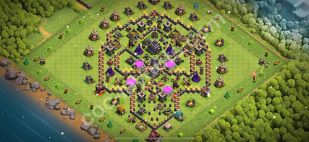 This Town Hall 9 war base is specifically designed to defend against 2-star and 3-star attacks in Clan Wars and Clan War Leagues. The strategic placement of defenses creates multiple compartments that force attackers to use more troops and spells than anticipated. Key defensive structures like Eagle Artillery, Inferno Towers, and X-Bows are positioned to cover crucial sections of the base, making it extremely difficult for opponents to secure a perfect attack. The core of this war base features a centralized Town Hall and Clan Castle, protected by multiple layers of walls and high-damage defenses. This layout forces attackers to commit significant resources just to reach the center, often leaving them without enough firepower to secure the Town Hall destruction. The anti-2-star design ensures that even if attackers breach the outer defenses, they'll struggle to achieve a 50% destruction rating. Air defenses are strategically spread to counter popular air attack strategies like LaLoon (Lava Hound + Balloons) and Electrone (Electro Dragons + Stone Slammer). The symmetrical trap placement and strategic Hidden Tesla positions create deadly surprise elements that can completely derail an attacker's plan. This base has been tested against various meta attack strategies and has consistently proven effective in preventing 3-star attacks.