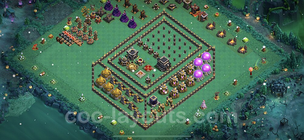 This Town Hall 9 war base is specifically designed to defend against 2-star and 3-star attacks in Clan Wars and Clan War Leagues. The strategic placement of defenses creates multiple compartments that force attackers to use more troops and spells than anticipated. Key defensive structures like Eagle Artillery, Inferno Towers, and X-Bows are positioned to cover crucial sections of the base, making it extremely difficult for opponents to secure a perfect attack. The core of this war base features a centralized Town Hall and Clan Castle, protected by multiple layers of walls and high-damage defenses. This layout forces attackers to commit significant resources just to reach the center, often leaving them without enough firepower to secure the Town Hall destruction. The anti-2-star design ensures that even if attackers breach the outer defenses, they'll struggle to achieve a 50% destruction rating. Air defenses are strategically spread to counter popular air attack strategies like LaLoon (Lava Hound + Balloons) and Electrone (Electro Dragons + Stone Slammer). The symmetrical trap placement and strategic Hidden Tesla positions create deadly surprise elements that can completely derail an attacker's plan. This base has been tested against various meta attack strategies and has consistently proven effective in preventing 3-star attacks.